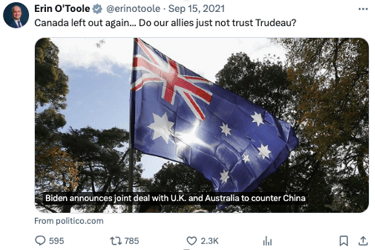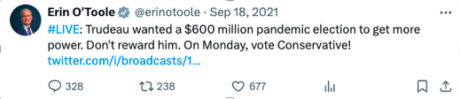 O’Toole’s campaign generally avoided some social issues, such as the LGBTQ+ rights and abortion. In many of his Facebook posts, instead of focusing on policy differences and contrasting visions for Canada’s future, he opted for backlash against his opponent, Justin Trudeau (See Fig. 10). One of his tweets from September 18, 2021, wrote the following, “Trudeau wanted a $600 million pandemic election to get more power. Don’t reward him. On Monday, vote Conservative!” (See Fig. 11) He also made a tweet on the skyrocketing costs of living under Trudeau and a post on his Facebook page about the total federal debt of all prime ministers (See Fig. 12).