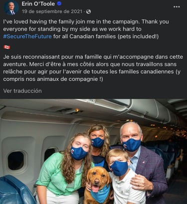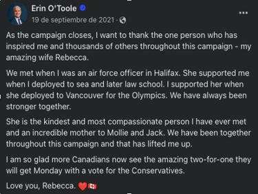 His campaign targeted messaging tailored to specific demographics, including suburban voters, small business owners, and families to resonate with diverse segments of the electorate. O’Toole also used digital advertising and social media to amplify key campaign messages and engage with potential supporters online. While campaigning, we can see how he also portrays himself as a family man, posting pictures and thanking his wife for supporting him in his journey (See Fig. 13). He also released a mini documentary about himself to sympathize more with his followers (See Fig.14). Aiming for authenticity and integrity, O'Toole's branding activities often matched his well-established political reputation as a pragmatic and moderate conservative. O'Toole's branding strategy, which catered to conservative interests and values, was moderately successful in enhancing his reputation as a steady and capable leader. He worked to draw in moderate and unsure voters while simultaneously assisting in keeping the Conservative Party's core supporters. It was difficult to set O'Toole apart from his predecessors and to overcome unfavorable opinions about the Conservative Party's prior performance, which might have reduced the campaign's overall efficacy.