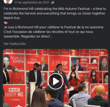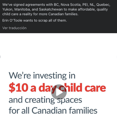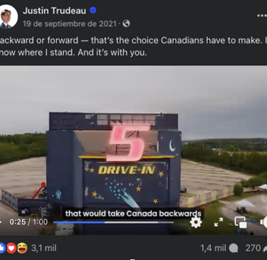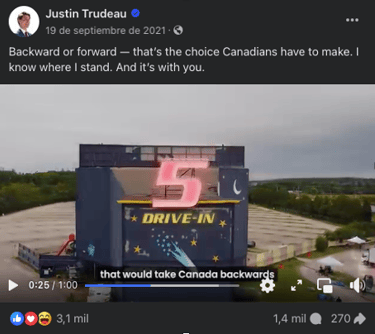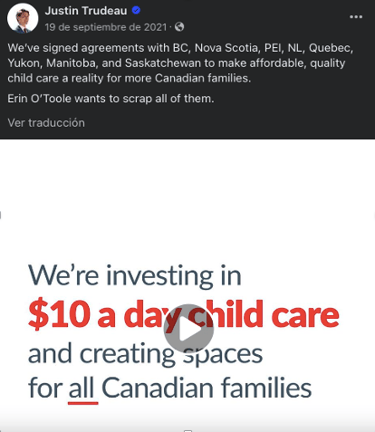Trudeau’s campaign, for the most part, generally avoided negative attacks on opponents, and instead focused on promoting its own accomplishments and future plans. “We’re facing two very different paths, between a Conservative Party that will take Canada backwards or a government that always has your back,” quotes one of the promotional videos posted by Trudeau on his Facebook page prior to the election (See Fig. 5). In another post he made on his Facebook page, he wrote “We’ve signed agreements with BC, Nova Scotia, PEI, NL, Quebec, Yukon, Manitoba, and Saskatchewan to make affordable, quality child care a reality for more Canadian families. Erin O’Toole wants to scrap all of them.” (See Fig. 6) Another post stated “While the conservatives are busy debating the existence of climate change, we’re taking action to protect the environment.” (See Fig. 7) These were among the few posts that targeted the Conservative Party or its leader Erin O’Toole. Overall, Trudeau steered clear of controversial issues, opting for a more inclusive and positive approach.