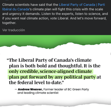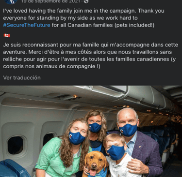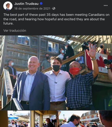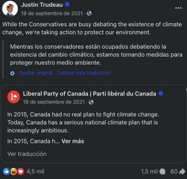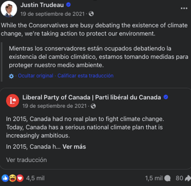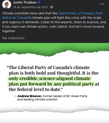 After analyzing data from the Liberal Party 2021 Platform and Justin Trudeau’s Facebook and Twitter posts from the 2021 federal election campaign, here are some insights of what branding for the Liberal candidate looked like. Trudeau’s campaign aimed to convey messages of hope, progress, and unity, emphasizing themes of inclusivity, diversity, and social justice (See Fig. 1). His key messages included commitments to building back better post-pandemic, advancing climate action (See Fig. 2), strengthening healthcare, and supporting economic recovery. Based on his Facebook posts, Trudeau’s campaign used emotive storytelling, personal anecdotes, and visual imagery to connect with voters on an emotional level. He presented himself as a family man and a leader involved within the community (See Fig. 3 and 4). His messages highlighted his leadership qualities and presented him as a compassionate and visionary leader able to guide Canada to recover from the pandemic and get through the challenging times.