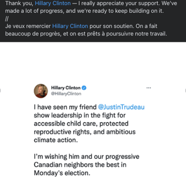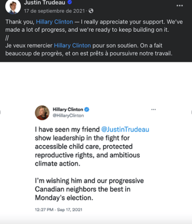 His campaign utilized innovative tools such as interactive websites. The Liberal Party 2021 Platform had an overview of their top priorities at the time of the election which included finishing the fight against COVID-19, a home for everyone, better healthcare for everyone, a more resilient economy, a cleaner, greener future, and reconciliation. It also included all platform commitments like Mandatory Vaccination, Support Implementation of Federal LGBTQ2 Action Plan, Zero Emissions Vehicles, $10 a Day Childcare for Families, Women in the Economy, among others (2021 Platform | Liberal Party of Canada n.d.). Trudeau also used the support of well-known personalities like Hillary Clinton (See Fig. 8) and Barack Obama, lobbying, and popular culture as a means of increasing appeal and legitimacy. The Liberal Platform also had the party slogan which was “Forward. For Everyone.” The party advocated for prioritizing Canadians' health, addressing middle-class concerns, supporting families with affordable childcare, and tackling climate change and systemic issues. The slogan emphasizes the need to move forward rather than regress, presenting the platform as a pathway for the country's future (2021 Platform | Liberal Party of Canada n.d.).